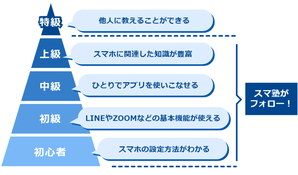 『スマ塾』では、スマートフォンに詳しい講師が、本当に便利なアプリや使い方だけをピックアップしています。スマートフォンの電源の入れ方から、これから流行するアプリまで、初心者から上級者まで幅広くフォローします。